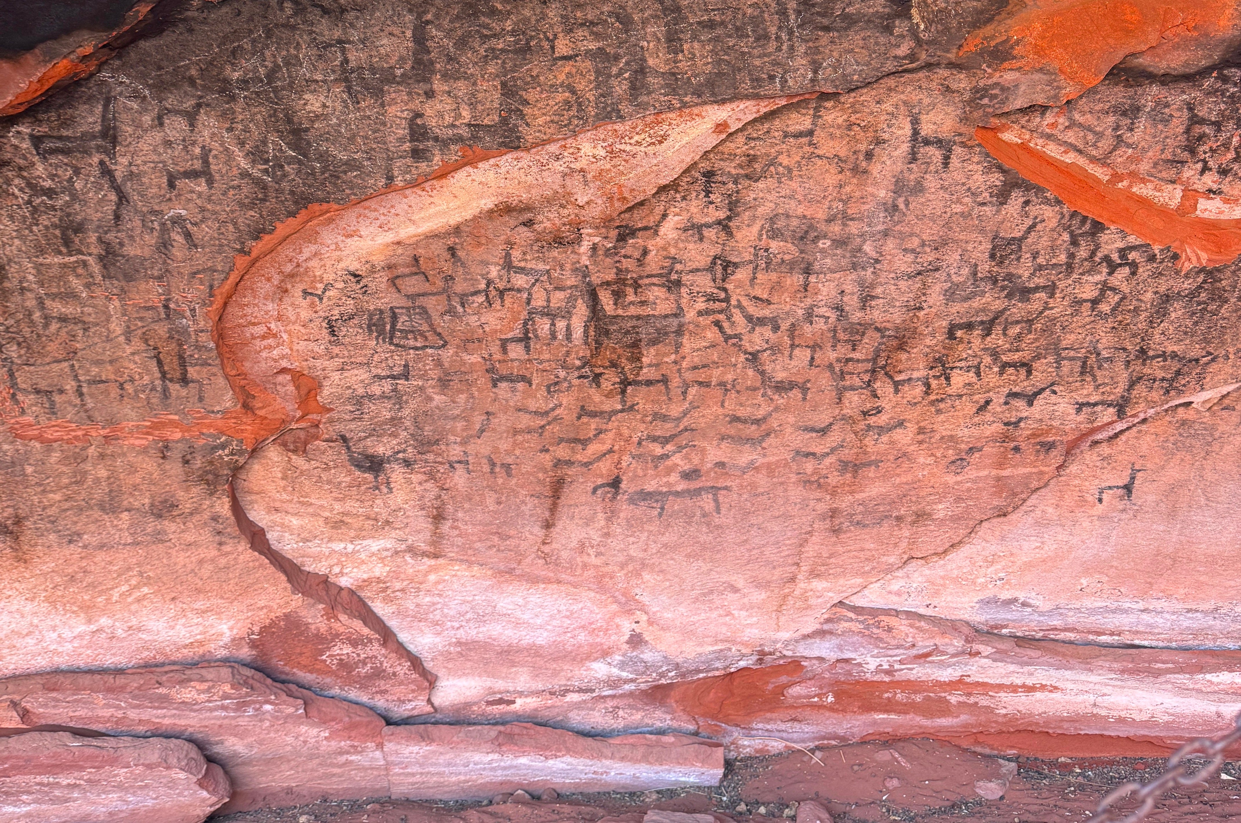 Inca Cueva, is a hollow under rocks, filled with Indigenous and Inca-era cave paintings. The way is about an hour’s walk along a riverbed, that takes you up into a sort of miniature canyon/crevasse, which is empty of water in the dry season. There are many spraypainted arrows pointing along this riverbed at the start of the trek and then, suddenly, none. Not even a helpfully tied scrap of a plastic bag.