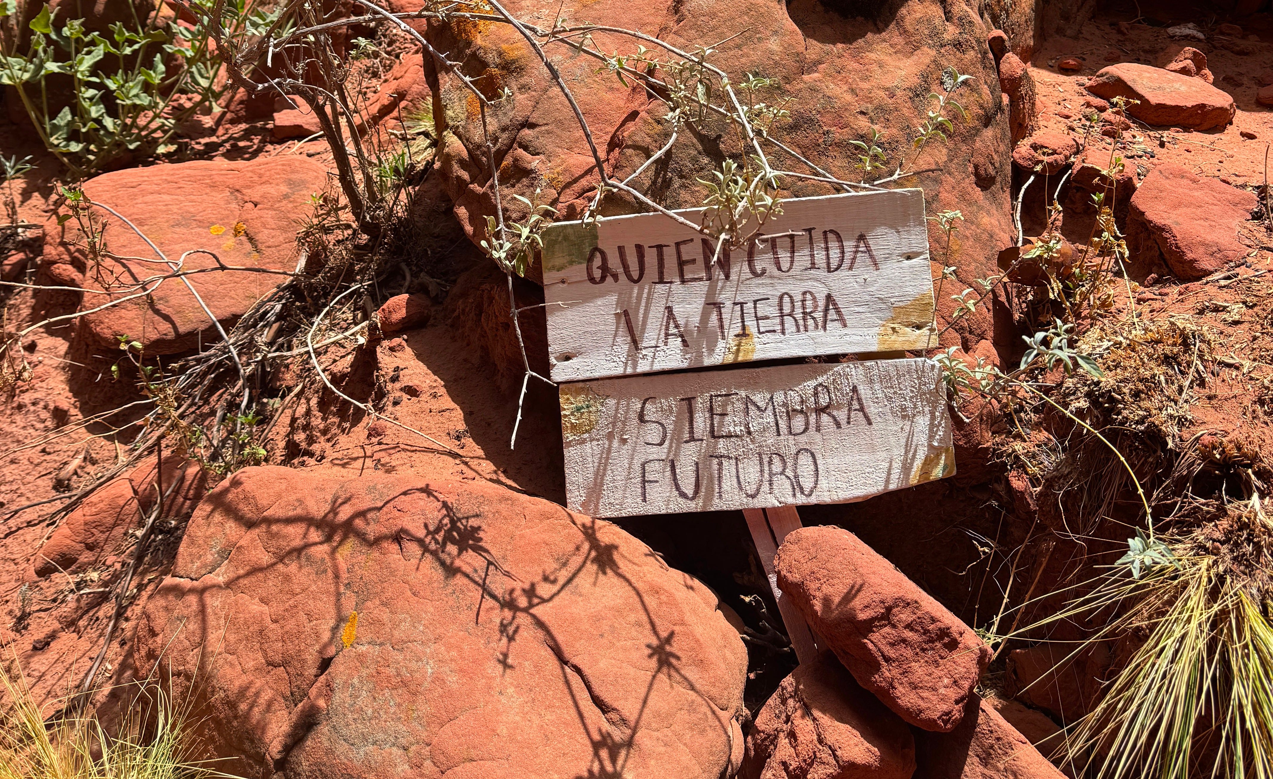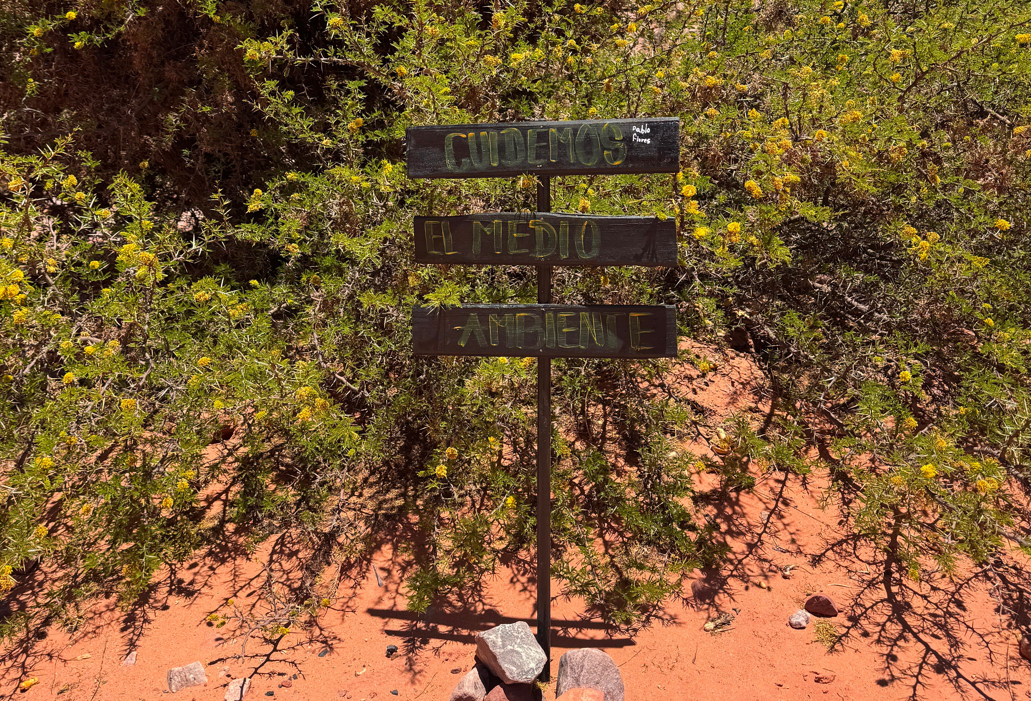 Instead of advising us which way to go, Pablo’s signs remind us of how to think about the nature we are passing through, from an ecological and conservationist perspective. Not “this way only” or “do not walk here” but “plant seeds” or “this is our garden, protect it from rubbish” and other heartwarming eco-positive messages.